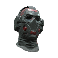A closed black and red mask with black balaclava.