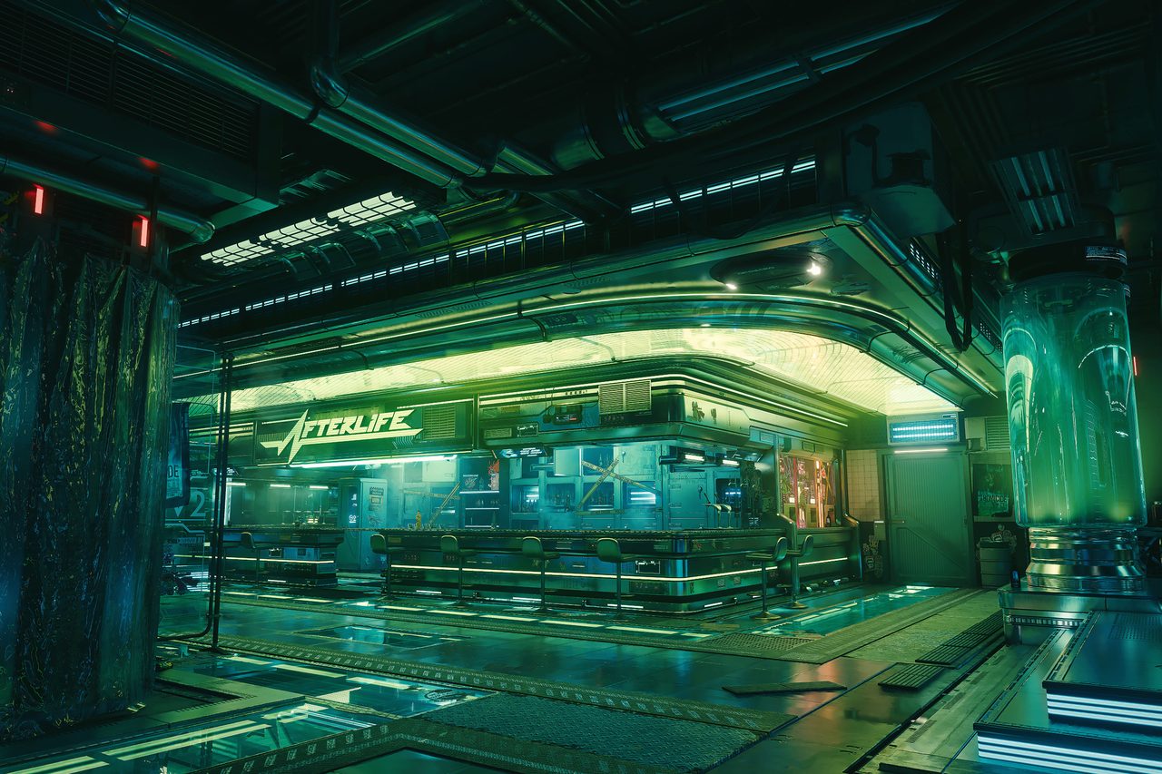 As the old saying goes "There is only one path in Night City worth walking: the one that leads to the Afterlife." Once you make it here, sooner or later, everything else opens up to you. The Afterlife is an iconic bar where the who's who of mercs and first-rate fixers gather to kick back or conduct biz. It's also a major nerve center for the city. This is place where the biggest deals get cut and the job rewards have the most zeros tacked on. Stop here to spot big names such as Rogue, Dexter DeShawn and that guy who "drank with Morgan Blackhand once"... Speaking of , it's said Blackhand's ghost still wanders the bar, switching off the safeties of customers' holstered guns. Of course, it's probably best to check that out for yourself. That is... provided you've earned enough street cred to get you through the front door.[6]