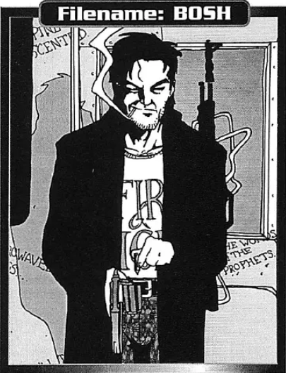Bosh's personality is the most disquieting thing about him. Normally talkative, friendly, and laid back, with sarcastic comments and funny sayings, while "on-duty' he becomes brooding and morbid. Worse, he takes an almost obscene pleasure in fulfilling a bounty, dead or alive. Even stranger is Bosh's bizarre hunger for junk food. His eating habits would make a sharp-suited, health-crazed Mover drop dead on the spot. When encountered, Bosh is constantly noshing on something repugnant.