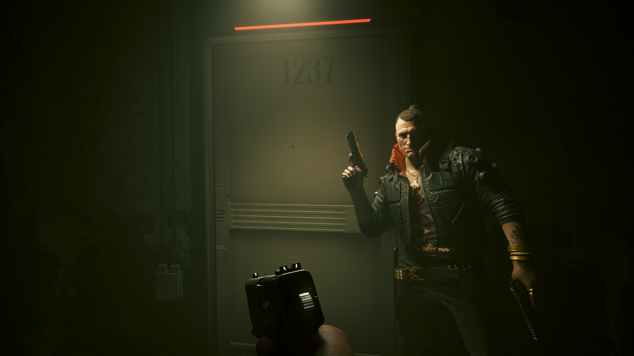 • When leaving the apartment, the elevator ride down to V's vehicle advances time to 10:00 PM, to transition from day to night time for the following chase sequence.