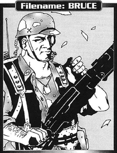 Always reacting before thinking has given Bruce a very checkered past, with numerous enemies among his fellow mercenaries and ex-employers. It has also lead him to new friends as well—he is owed a considerable favor from a Raven Microcyb executive, when Bruce's team successfully fought off a large, helped out a police SWAT unit, giving them cover fire during a boostergang ambush. He has had a string of short, but passionate affairs, with only one real relationship which finished when she recently accepted a bodyguarding job.[1]