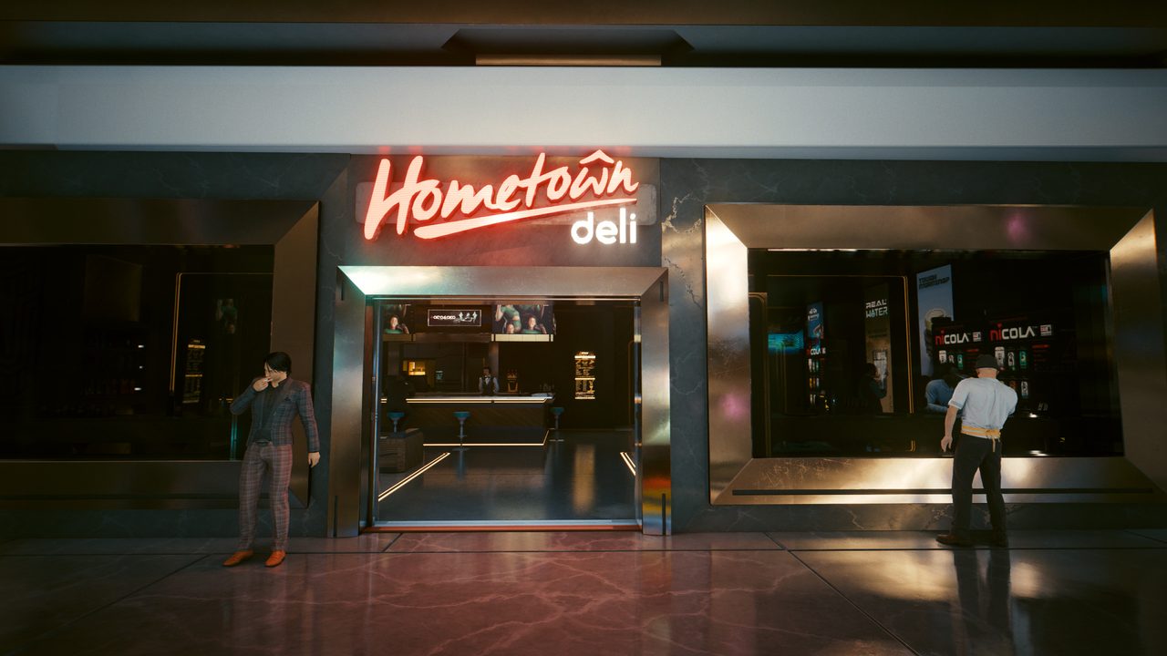 • In Cyberpunk 2077, the sign on the bar is a reused asset that reads "Hometown Deli."