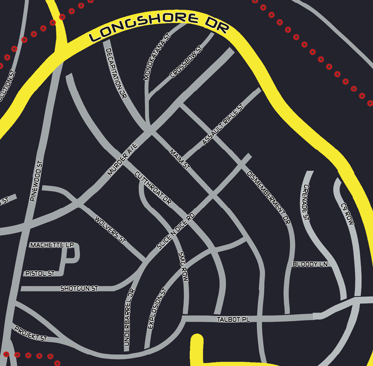 - All streets in the film set were named after weapons such as "Machete Street" or "C9 Row," as well as to related topics such as "Murder Avenue" or Underbarrel Drive."