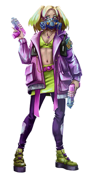 Not much is known about Corpse Reviver's past, though what little is known indicates that she grew up in one of Night City's Combat Zones. She chose to rebel against her life of poverty and live a life of fake bliss and unending joy by joining the Piranhas, where she quickly rose to become the gang's leader after her predecessor died of overdose.