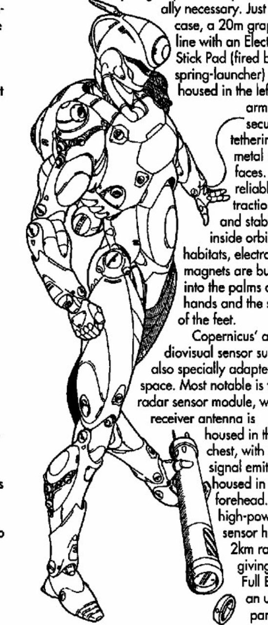 By no means a helpless observer, Copernicus can do much more than simply survive in space: 36 micro-verniers are clustered across the body in retractable housings, enabling this Full Borg to perform maneuvers without needing to push off against any surfaces (this effectively adds +2 to Zero-G Maneuver skill). A central fuel storage pod, which is loaded into a receptacle in the borg's lower back, allows enough fuel for 12 hours of EVA maneuvering. In addition to these maneuver rockets, Copernicus has one main thruster nozzle built into the back of the upper body: this compact rocket-propulsion system (usable only in zero-G) can grant acceleration of 5 meters per second squared (or an ever increasing speed of about 10mph per second). Its replaceable solid fuel supply has enough fuel for 20 seconds of burn, giving Copernicus the ability to get up to 200mph if it's really necessary. Just in case, a 20m grapple-line with an Electro-Stick Pad (fired by a spring-launcher) is housed in the left arm, for secure tethering to metal surfaces. For reliable traction and stability inside orbital habitats, electro-magnets are built into the palms of the hands and the soles of the feet.