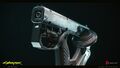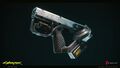 The Quasar is perhaps the most distinctive weapon you can find in Night City. It features an unusual, angular frame, classic disc magazine and one-of-a-kind techology. After all, the Quasar is an electromagnetic gun. The barrel holds four electrically charged shafts, which, in combination with the bullet, form opposing electromagnetic poles. The resulting forces release the bullet – at lightning speed. A shot from the unassuming Quasar can even pierce armored vechicles[sic] and bulletproof vests.