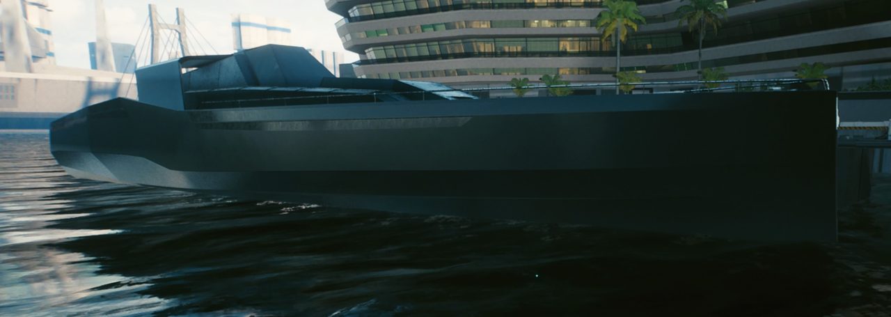 A luxury yacht moored at the Gold Beach Street marina. Titillating rumors abound over the parties held on Mordellini's vessel. It's said only Night City's elite of the elite ever attends, but not a one of them has uttered a peep and no uninvited guests have ever managed to step aboard. Just what happens at the yacht's orgies of legend remains solidly in the realm of fantasy and conjecture.[2]