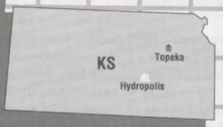 The state has been devastated by droughts and global warming causing it to become a dust bowl desert. The entire western half of the state has been abandoned to its fate, having been designated as a new Indian reservation and therefore ineligible for any state support. One town called Hydropolis focused on hydroponics and has been successful enough to attract the attention of some lower-echelon executives from Biotechnica.[1] As of the 2070s, Kansas was home to many syn-meat farms.[2]