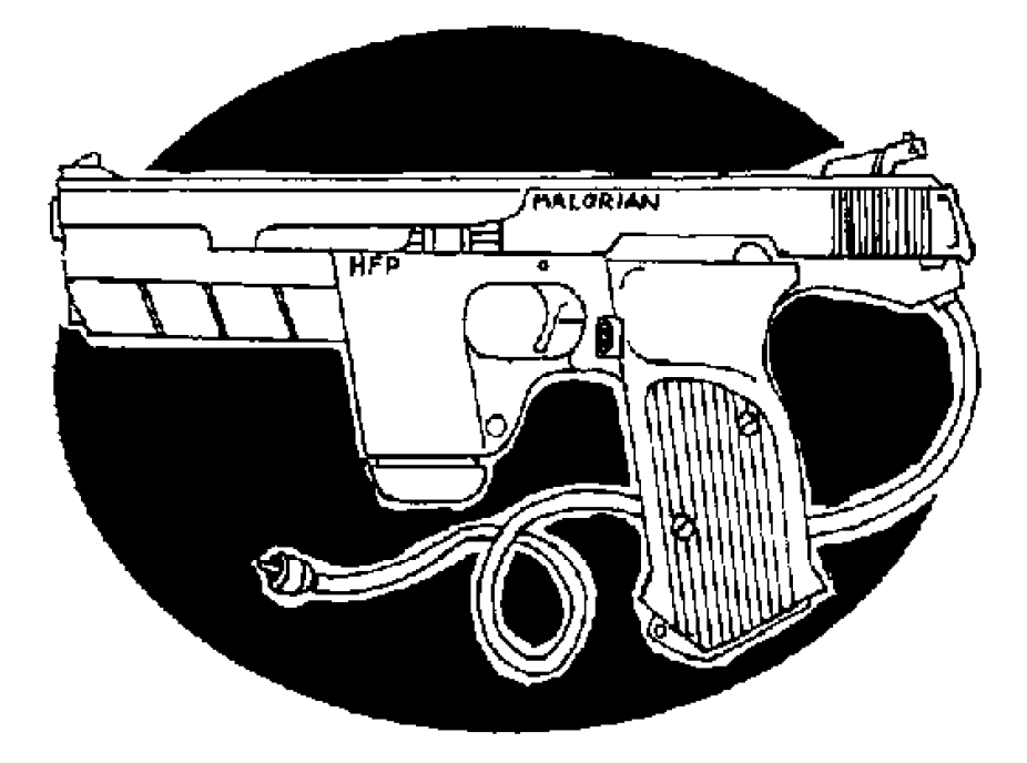 Malorian Arms Heavy Flechette Pistol is heavy flechette pistol. Firing a single 150 grain, 4mm dart at over 1700 feet per second, the Malorian Arms heavy flechette pistol is second to none in flechette handgun technology. Using a liquefied gas combustion system, this semiautomatic pistol packs a serious wallop in a handgun-sized package. The rechargeable liquid propellant reservoir can fire over two hundred rounds before needing a refill (30eb). The large magazine capacity makes this weapon a favorite with firepower freaks everywhere. Eran Malour has specifically designed his new flechette gun with the "enhanced" customer in mind. The weapon comes chipped from the factory, safety interlocked and encoded to the owner, so use by anyone else is impossible. This feature is a definite plus to anyone needing a strong home defense weapon, but who worries that children might hurt themselves with an accidental discharge.