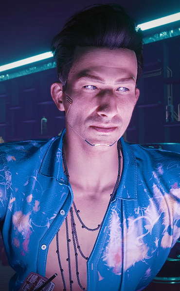 Whether a resident or tourist, one may easily perceive that tending a bar in Night City, in the most densely-populated of its districts, is not quite for the faint-hearted. To withstand such adversity, an abundance of character, nerves of steel and a broad understanding of the night life psychology is mandatory. Sprinkle that with a shimmering layer of charisma and you have Mateo Thiago. For all intended purpose, at least the side he'd allow to show. Maintaining customer relations on a rather warm and personal, yet fairly professional level, he can be trusted by both patrons and fellow Moxes not to prattle, gossip or grace the unwanted ears with valuably unintended information. Antithetical to the common inhabitant of the city he works in, Mateo will not succumb to financial gain. Information cannot be bought from him, regardless of the amount offered. He does however appreciate the gesture of a big tip, although holds moral principle beyond capital and would rather sell you a drink for it.