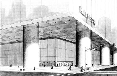 The Tower's architecture can be best described as unimaginative: a square tower that goes straight up for eighty-two stories with the only piece of stylistic design being the all-around cantilever on the ground floor, other than that concrete columns rise from the ground to support the edge of the fourth floor where the cantilever begins with a forty foot high glass wall with steel supporting members standing behind the columns and rings the bottom three stories around the base of the tower. Unlike the Lazarus or Arasaka buildings Militech does not have a concourse or plaza surrounding its headquarters with it instead connecting directly to the rather large side walk that wraps around the whole building.