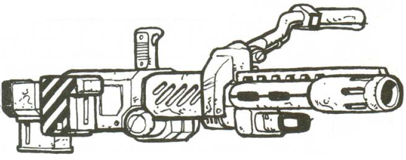 Advances in electrothermal propellant technology have made a great many guns shoot harder and faster. Militech figured, why not use it to make a big gun shoot just same, but make the gun lighter? The answer is the BMFG, a truly man-portable 30mm cannon. Of course, ifs portable as long as the carrier doesn't mind the 25 kilos of mass for the weapon, an additional 5 kilos for the battery pack, and 5 kilos per clip of extra rounds. But it can be fired by an unassisted man (recoil factor 9). The cannon is, of course, smoothbore. Since the weapon can't be fired from the shoulder, some sort of smartchipping (if nothing else, to a monocle) is highly recommended. Standard rounds cost 90eb apiece; a power pack recharge costs 25eb.[1]