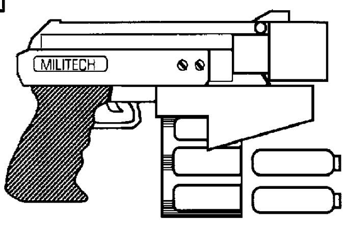 Militech Mini-Grenade Launcher is grenade launcher. Militech has developed a new grenade projectile sixty percent smaller in size (25mm x 70mm), but having the same range and effect as the standard 40mm grenade. Two styles of launcher are sold by Militech. The first is a pump-action, shotgun-style launcher with a tube magazine holding four rounds. This version is the one normally mated onto Militech's M-31a1 Advanced Infantry Combat Weapon, or the Militech 10 SMG. The second design has a large rotary drum with a sixteen-round capacity, constructed on a modified Militech 10 frame. This weapon's settings allow a shooter to select between the ammo types that have been loaded. For example, the shooter could fire a tear gas shell, select an HE round, fire it, then select a flechette round, all without reloading! The weapon automatically rotates the drum to place the specified type of round into the chamber. Both weapons can also use 10-gauge shotgun ammunition.