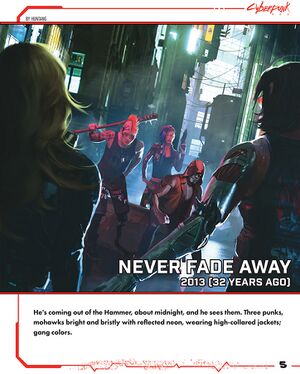 Never Fade Away is a mini-adventure featured in Cyberpunk 2013,[1] Cyberpunk 2020,[2] and Cyberpunk RED,[3] as well as a quest in Cyberpunk 2077. It is the opening of what is considered the Cyberpunk story.