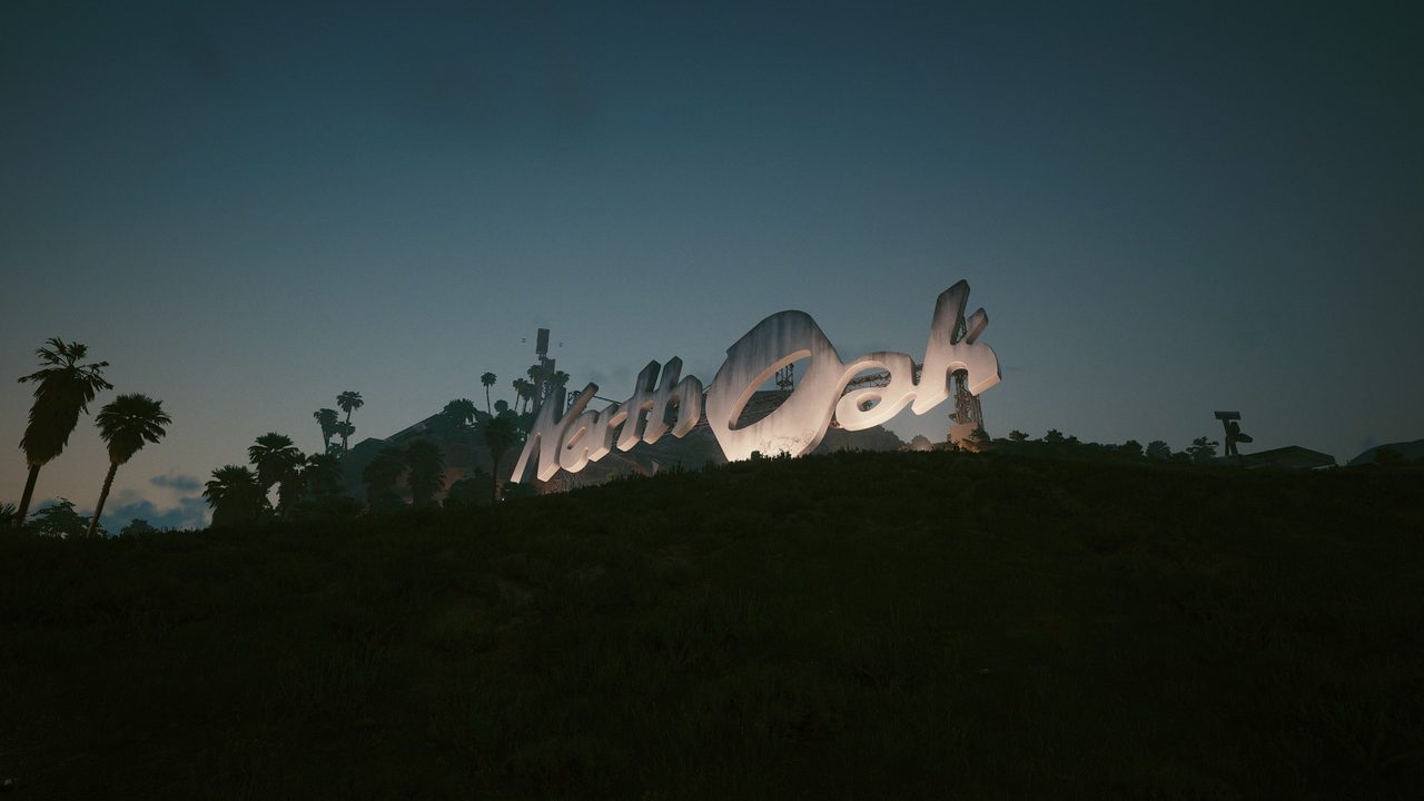 North Oak is the newest part of Night City. It's the exclusive residential district, free from the poverty and gangs that plague the city. More than 50 years ago, there was nothing here than arid hills framing the north-eastern border of Night City. After the Nuke Incident and the destruction of the Arasaka Towers complex it became the site of temporary refugee camps and favelas for the next 25 years.