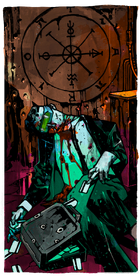 The background of this card consists of four onlooking figures with singular, cybernetic eyes against abstract shades of varying orange, brown, and pink from top to bottom. In the foreground is a man, upside-down, with legs tied and bound from some location above and outside of the scene of the card, the figure hanging by the legs. The figure's clothes are plain black paints, white shirt, and a black jacket of some sort, almost like a business-suit type outfit. The figure is bald, and their face gone, instead with a golden skull in place of where the facial features would be.