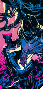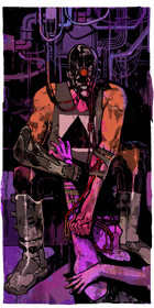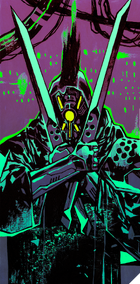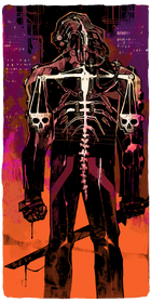 The background is abstract but somewhat symmetrical; the bottom of the card is a haze of orange, the top of the card splits down the middle, with black taking the center, and two purple, towering buildings with various pipes and wires coming from them rise out of the orange hue below. At the center of the card stands a figure, back to the viewer yet head turned left as though to look behind, at the viewer. The figure's body is entirely black, with some light purple accents. On the figure's back is a bone-like design, slightly emulating typical skeletal structure until the shoulders and arms are noticed, whereupon the viewer realizes that the bone designs form the shape and form of scales, such as in the idea of the scales of justice, with the scale plates being skulls. The figure's left hand is clenched, right hand holding a sword, both arms at his side. The figure's head has numerous wires, tubes, and cables stemming from the back of the skull, and what seems to be the left eye of the figure looks like a muted grey, as though looking through goggles of some sort.