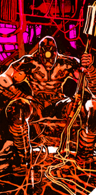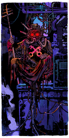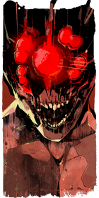 The Devil is portrayed as a cruel face of a man on a blood-red background, hungrily smiling, teeth barred. His many eyes are red, their placement copies the shape of optic implants used by members of Maelstrom gang.