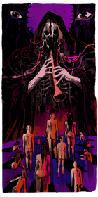 As with the classical depiction of Judgement, this card features a great trumpeter, under which numerous nude figures emerge from grave-like holes, called to resurrection. However, instead of the angel of the classical depiction, this trumpeter is a cloaked, skeletal figure. Where an angel's wings might have been, there are a pair of dark shapes behind the trumpeter. Each sports an intently-gazing eye and teeth-like spikes, forming a vertical maw-like shape between them.
