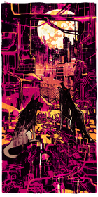 The scene of this card is a hectic urban mess; the full moon tinted a light yellow illuminates and takes up much of the top center of the card, with infrastructure wires and cables tinted in fiery pinks and blacks crossing just over it, and a mass city scape in the distance framing the bottom of the moon. Close to the viewing angle are two wolves, the one on the right howling, amid a collection of scrap metal and bones, with one skull in the pile of rubbish.