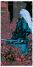 In the background, a mix of two towering skyscrapers tinted red against a pitch black sky at the top of the card, and from the middle down, floral, natural imagery with flowers, plant stems, and other such scenery about, tinted in a gradient from muted purples at the middle to reddish pinks at the bottom. At the center of the image and slightly to the right, a lone female figure tinted in blue stands, eyes closed, facing to the left. Long white hair flows behind her as her face is tilted upwards. On the left sleeve of her long kimono is a female-gender symbol, and grasped in her left hand is an unsheathed katana.