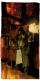 This card takes place in metallic beams and supports, with a gradient of a deep red the further away from the focused scene the background is, to a brighter yellow from mostly unseen illumination. Towers and support beams make up the upper background, whereas the central background is of a short wall, and the bottom of the card features a concrete ledge with unseen lighting below. A cloaked figure with staff in right hand and torch in left stands on the ledge, facing towards though a bit facing to the left of the viewer. Their robes are dark and the figure seems to wear a gas mask with a tube that snakes downwards and behind their torso. One eye of the gas mask is partially visible under the figure's hood, and it is a mild yellow in hue.