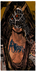 The background is basically non-present, as a feminine figure from the chest-up takes up the majority of the image, bar dark, dirty yellow in the top two corners. The figure is hooded, but where their face would be is entirely visible. Instead of a face however, is only hollow metallic beams and supports criss-crossing to form a chasis-like structure, with two red dots for eyes un-centered, instead located shifted to the left and askew. The only human part of the face remaining is the chin and bottom lip. Below the head is clear human skin, as the neck leads to a partly bare chest, with a tattoo of a woman on the left prying open the jaws of a wolf at the center of the chest, the tattoo tinted deep blue. The clothes of the figure seem to be a hooded cloak with metallic features around either side of the torso's front, and the neck dips down to reveal most of the center of the female figure's chest, though her breasts are mostly covered by the U-shaped curvature of her robes.
