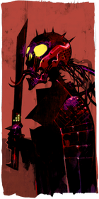 The background of this card is flat, light red. The card's entire focus is on its central figure, a left-facing cybernetic or robotic figure with a skull-shaped metallic head with spikes atop it and glowing yellow eyes. Out of the back of the skull, many wires and cables extend out of sight. The figure, with a forked organic tongue, seems to lick a short, angular sword held upright in its right hand, and the figure is adorned in samurai-like plated armor, creating harsh angular silhouette effects.