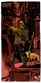 The image shows a red industrial background of cascading metal buildings, wires, and infrastructure. At the center in the foreground lit in yellow is a punk walking on a roof top with a malnourished dog by his side, walking to the left, one arm stretched in front of him, and his other arm carrying a stick. His right leg is in front of him, hovering over the edge of the building, as though about to step off the building's edge, unaware.