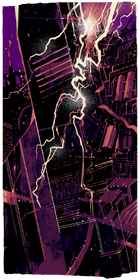 This card is distinct from many other cards; it in its entirety consists of one primary, obelisk-like pillar or tower in dark purple rising at a slight angle to the left in the center of the card, with industrial infrastructure in abstract, transparent manifestations on either side at the center and bottom. From the top right is a sparking, jagged bundle of lightning crossing down through the middle of the image.