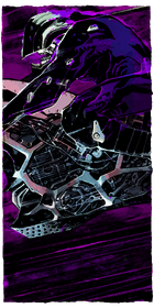 The image background is abstract, dark purple, with light purple lines conveying a sense of momentum and speed. The main figure of the card takes up roughly the top two thirds of it, being a figure hunched over in thick, seemingly leather clothing, also tinted purple, with a black curved helmet that curves downwards to a point in front of where the figure's nose would be. The figure's open mouth is visible, its skin pure white and ghoulish. The figure rides a motorcycle, noticeably natural in its light grey, reflective, and metallic coloration, with only the center of the motorcycle's body visible and not the wheels, and the figure drives the motorcycle towards the left.