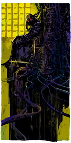 The background, tinted yellow, is almost entirely obstructed bar the upper left, which seems to emulate either warehouse windows or computer monitors stacked in a grid. Taking up the majority of space in dark hues of black, purple, and blue is machinery and wires forming a throne-like chair, viewed from behind and to the left. Hooked into the chair with many wires connecting to the head is a humanoid figure, head turned towards the viewer, with two bright red eyes, and no other clearly visible facial features. The figure is draped in loose, robe-like clothing.