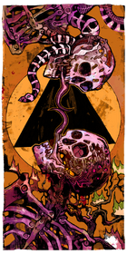 The image background is abstract and in layers; the backmost layer is simply a shade of slightly dark orange, in front of that is a yellow circle, and in front of that is a black triangle. At the bottom of the background is some sort of plant, seemingly with small green and red flames on a few points on its snaking, jagged branches. The card's main feature are the upper halves of two skeletons, one coming from the bottom of the card look up, and the other coming from the top of the card looking down. These skeletons are facing each other, with unnaturally long and pointed tongues slithering from their mouths, curving such that they come into contact with each other. The top skeleton has a snake of purple and white stripes slithering from the mostly-unseen ribcage around the neck and to the left of the top skeleton's skull, just past its lower jaw. The bottom skeleton seems to have more damage, and seems to have cybernetic wires and nodes on the left half of its skull, the left half being most visible to the viewer.