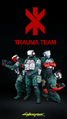 Operating from an AV-4 Urban Assault Vehicle of ambulance configuration and a belly-mounted minigun, Trauma Teams include a driver, one or more First Aid operatives, and two or more Solo security agents. A Dispatcher may also be part of the team, in charge of sending them on missions.[3]