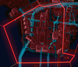 In the 40s, this part of Watson aspired to be the next City Center. Corps invested heavily in the area, putting up towers and cutting-edge clinics such as the Med Center. That's where you slapped down your credchip for implants - that is, if you wanted to get them legally. But soon enough this neighborhood became populated with immigrants, mostly from China, hence the name. Over the next few decades, the district became increasingly more populated and diverged from its original plans. Today Little China is considered a poor district, but its food, smells, neon lights, tucked-away little shops and overall atmosphere draws the crowds. Even low-ranking corpos drop in to gamble and put eurodollar bills into thongs. The sight of suits strolling past the homeless also shouldn't take anyone here by surprise.[2]